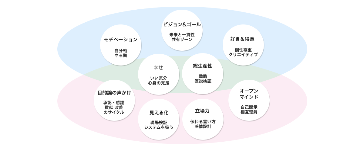 本人の「内発的モチベーション」、つまり、価値観やビジョンを見つけ、マネジメントに活かすことで、本人の好き・得意を活かしながら、パフォーマンスにつなげることができます。