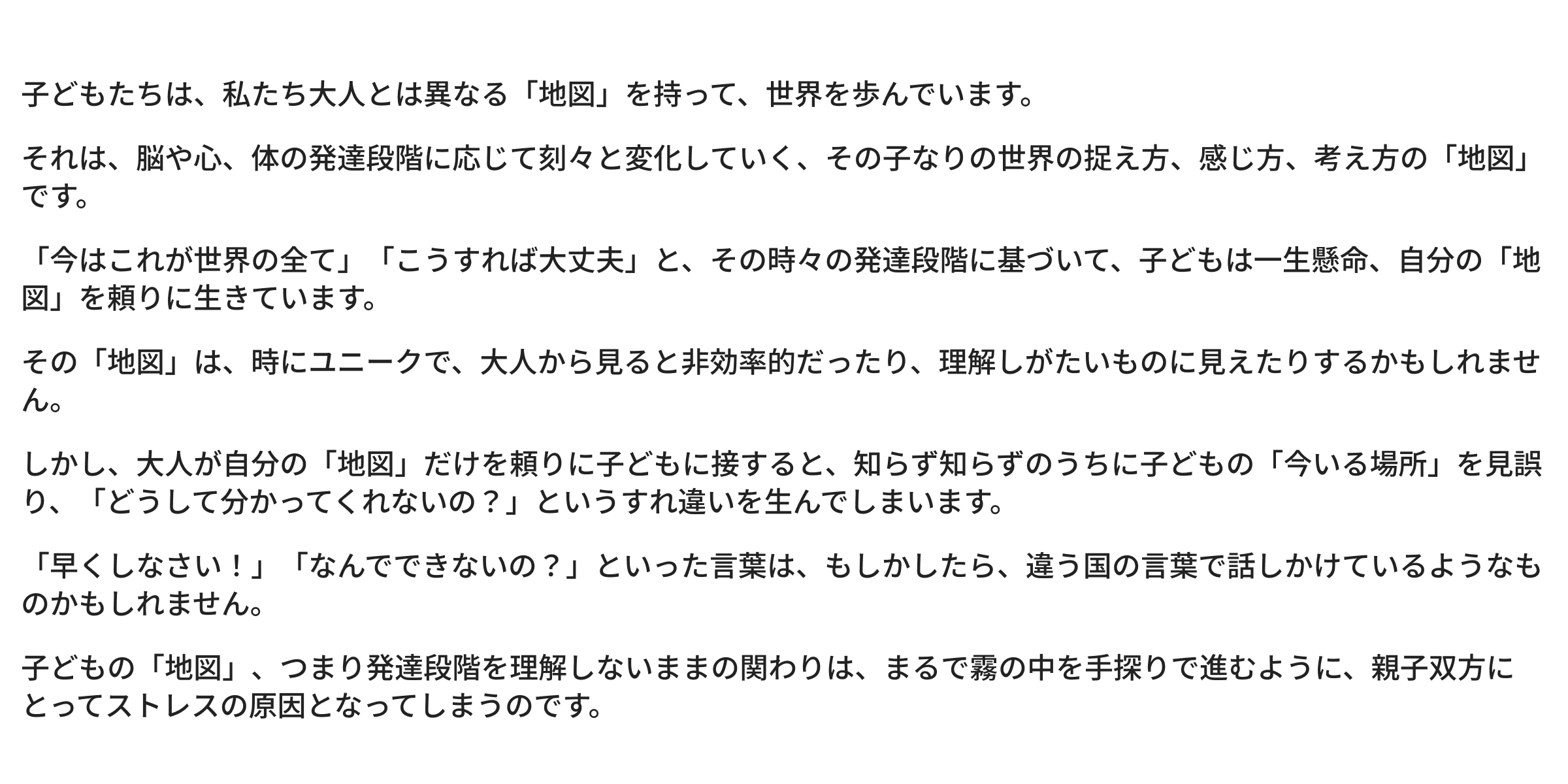 子どもの「地図」つまり発達段階を、理解しないままの関わりが、親子双方にとってストレスの原因に。