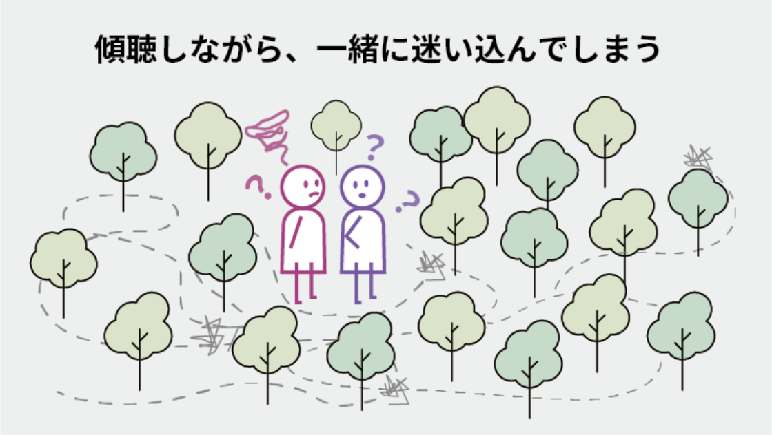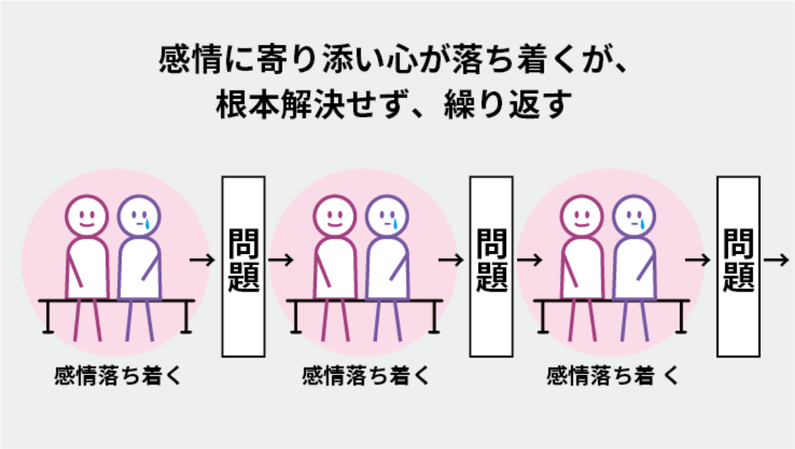 相手にしっかり寄り添い、共感し、感情移入。安心感を感じてもらえ、考えていることや感情を吐き出してもらえる。その場では、気持ちが楽になり落ち着いた状態になるが、日常での問題はなくならず、困った状況が続いてしまう。頼られているのか、毎回、同じような問題での相談が続いてしまう。依存関係になっているのではないかと心配だが、どうしたらいいかわからない。