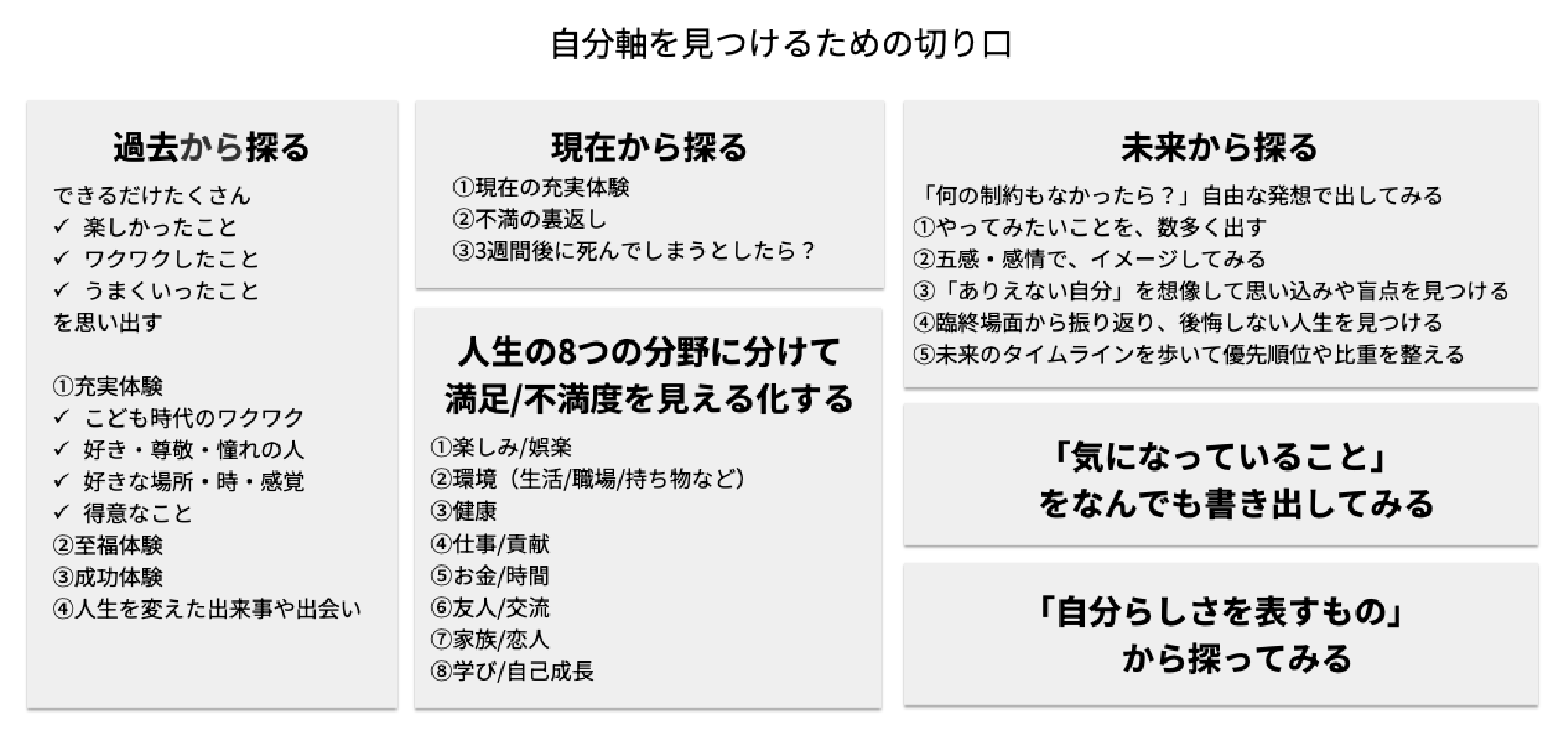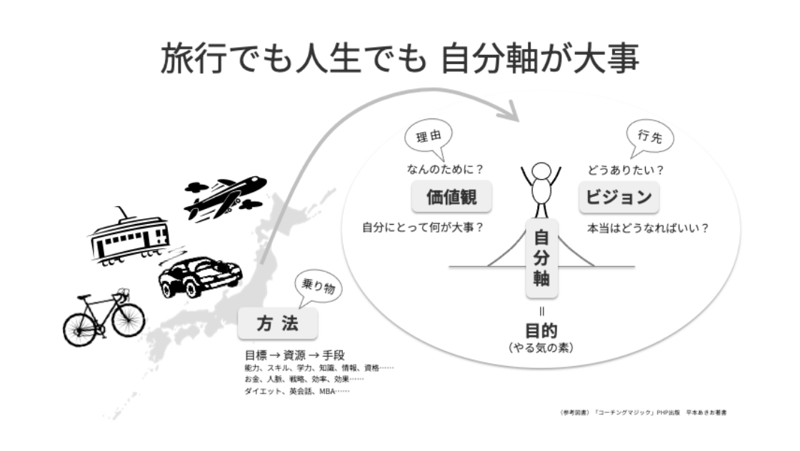 それら全ての指針・基準となるのが、あなたにとって「何が大事」で、あなたがこの先「どうなりたいか」、あなたが「自分をどう捉えているか」という「自分軸」です。