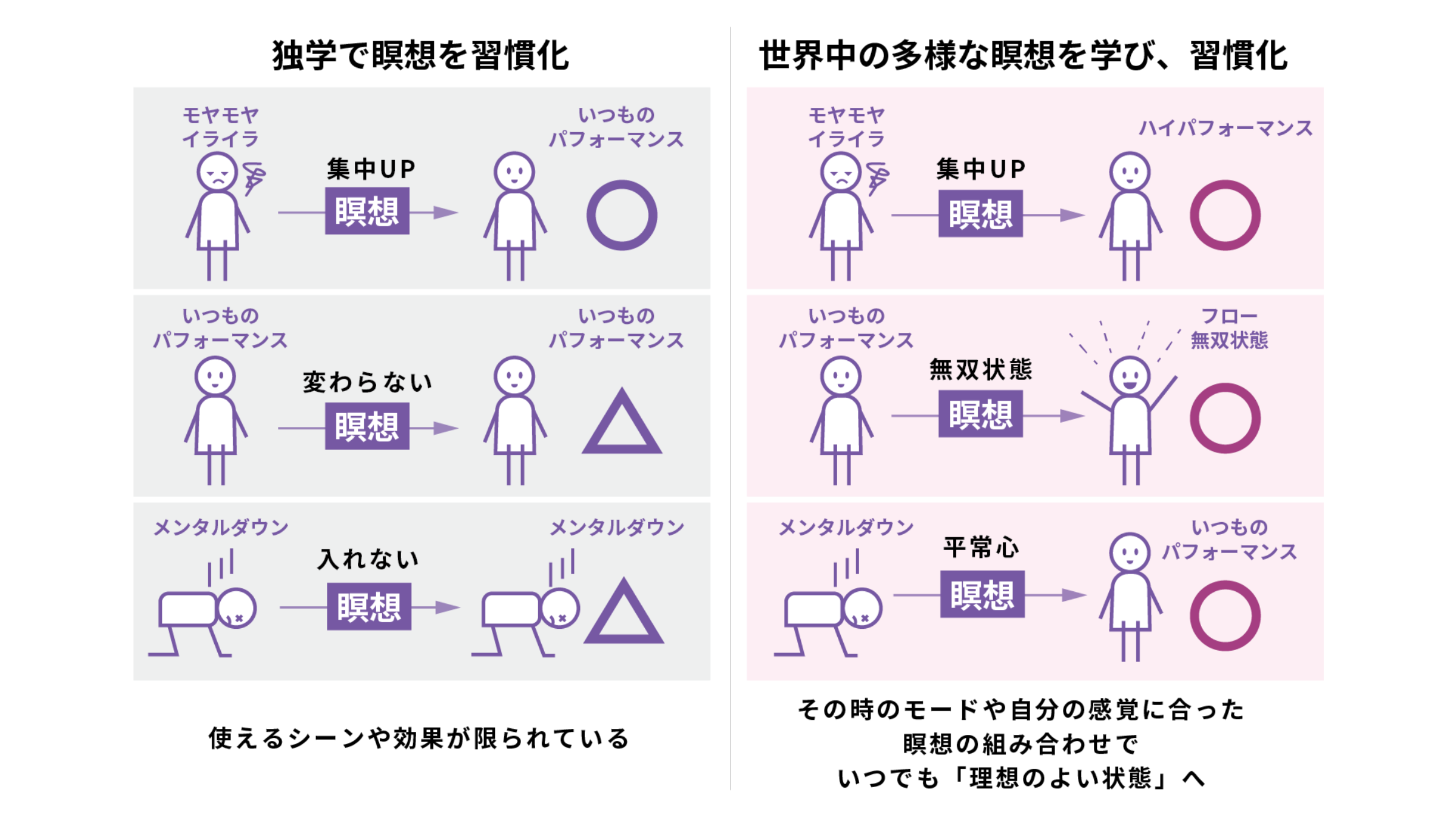 世界各地で発展してきた様々な流派の瞑想法には、人類の知恵がつまっています。それらを体系的に理解し、現代のビジネスパーソンが日常生活に取り入れ、すぐに効果を実感できるようアレンジしたメソッドを、集中して学びます。