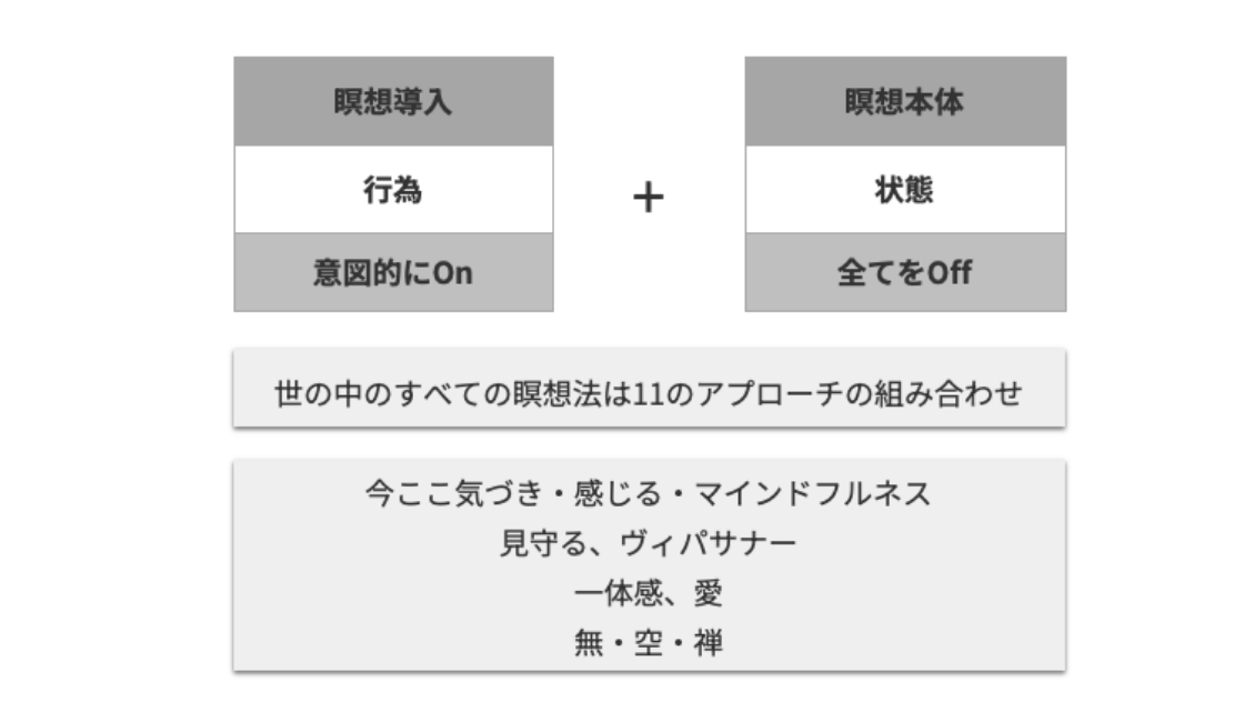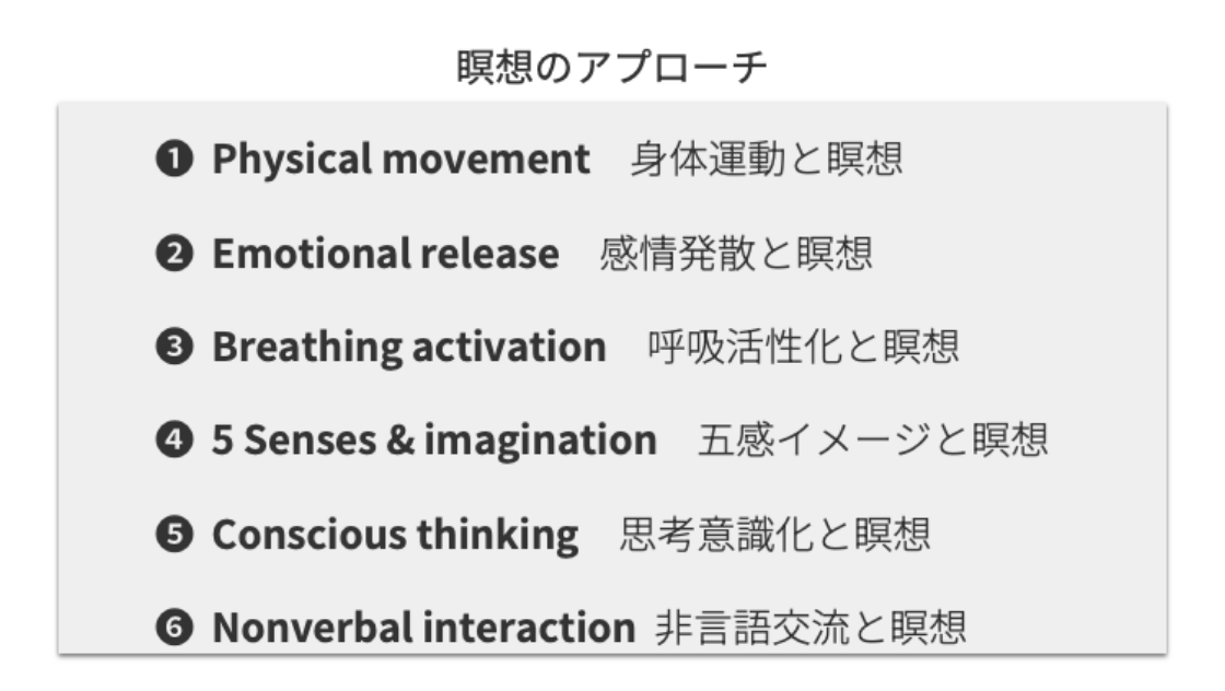 世界のありとあらゆる瞑想法を分析した結果、11のアプローチにまとめることができます。そのうち、一般的に活用しやすいのは6つ。①身体運動②感情発散③呼吸活性化④五感イメージ⑤思考の意識化⑥非言語交流の6つです。それぞれ、効果が得やすい方法を厳選して、体験しながら理解を深めます。自分にあったアプローチを見つけることで、短時間で深い瞑想に到達することが可能となります。