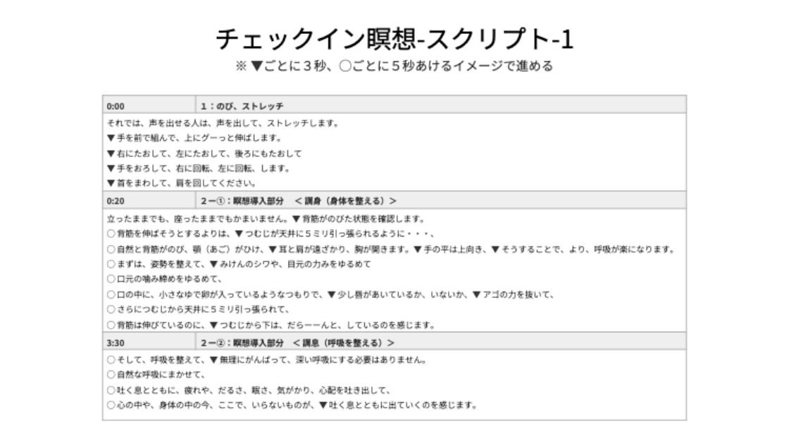 瞑想をシンプルに、普通の人相手にお伝えするために、説明資料の雛形を用意しました。マスターするインストラクションは、2種類。ビジネス場面で使いやすい静かな瞑想法と、子どもから楽しめる動きのある瞑想法です。職場や教育現場で、周りの人と一緒に瞑想タイムを取ったり、コンサルタントやフィジカルトレーナーの人がご自身のサービスに取り入れたりと応用範囲が広がります。