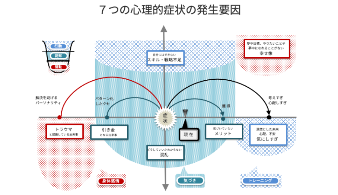 心理的症状の7つの発生要因、3つのレベルのアプローチ、仮説検証、カウンセラーの影響力、過去は必然、未来は不確実