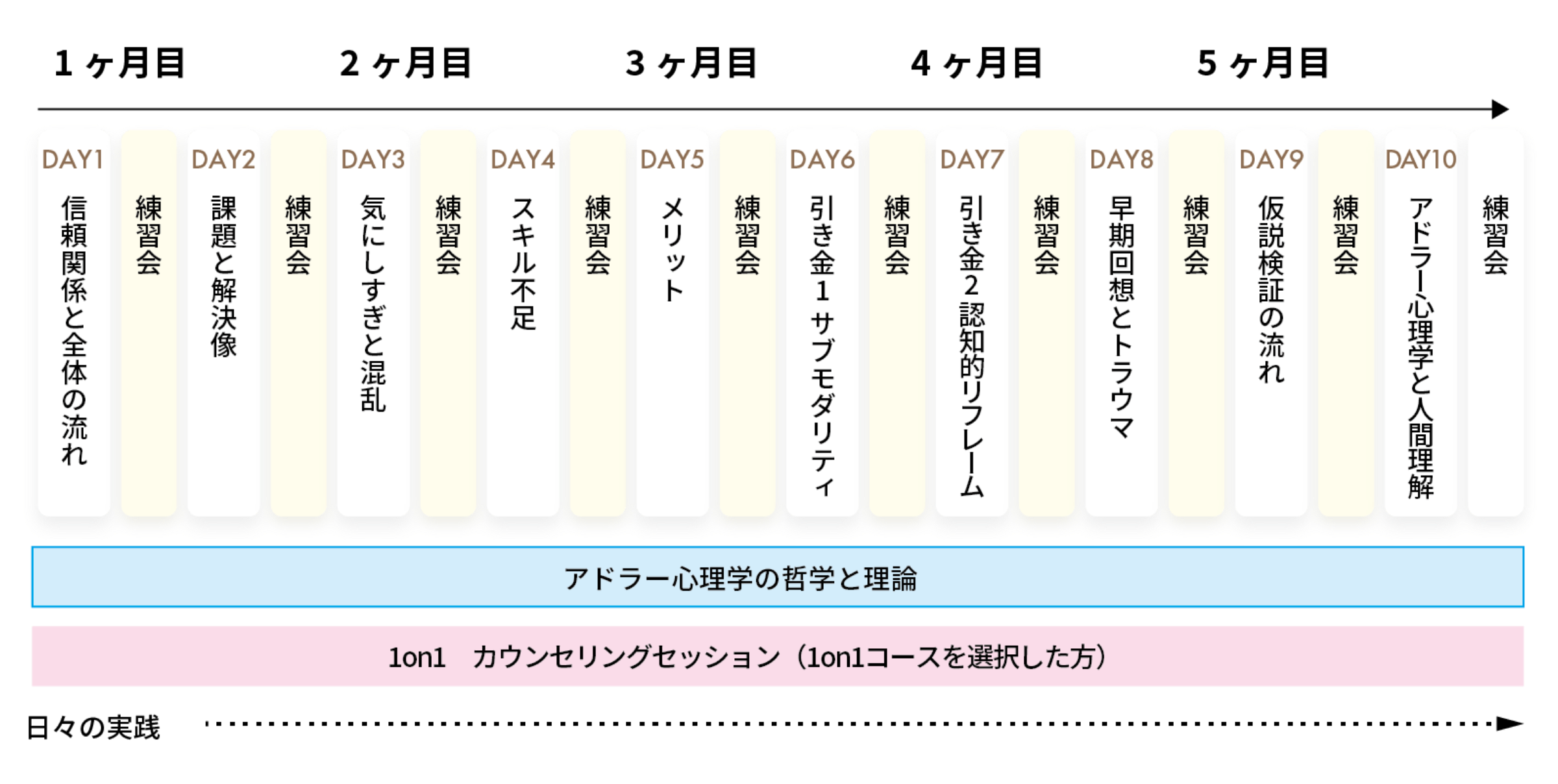 カウンセラー自身が、「自己受容」「他者信頼」「貢献感」について理解を深めながら、アドラー心理学の理論「人生の主人公」「目的論」「認知論」「全体論」「人間関係論」について、カウンセリングにどう関連し、どのように活用したらいいのかを学びます。